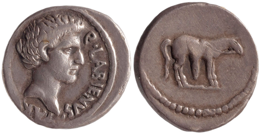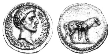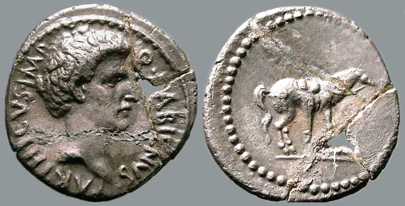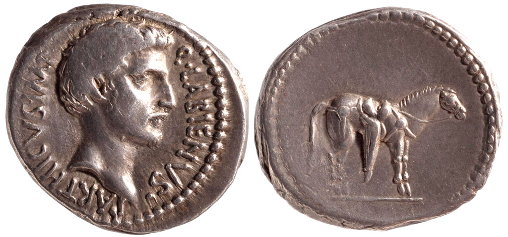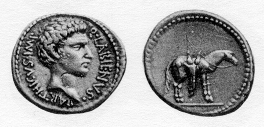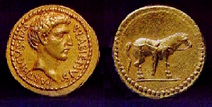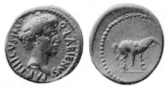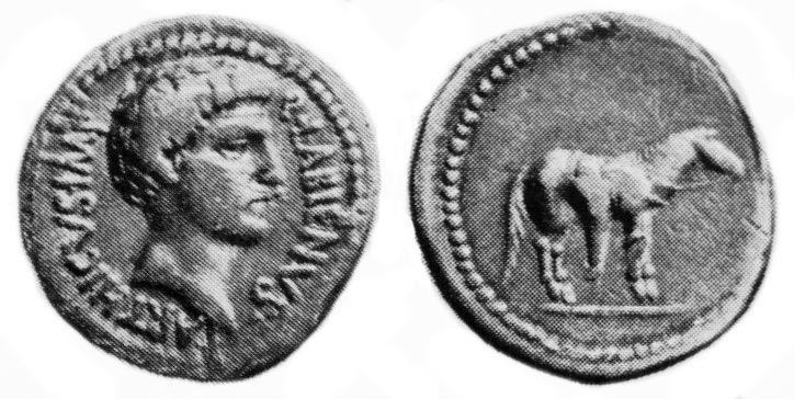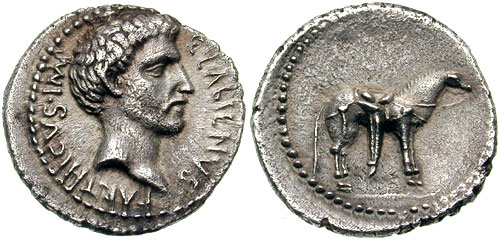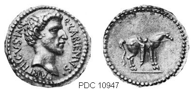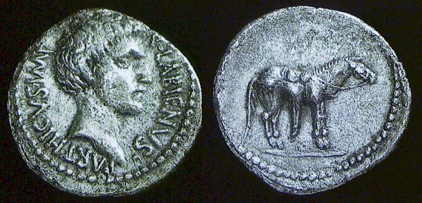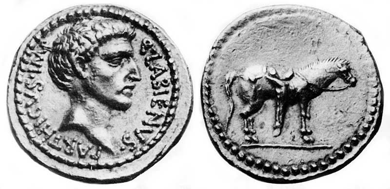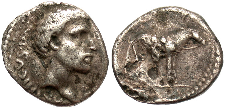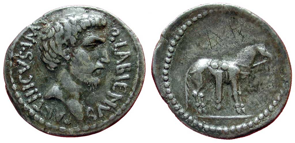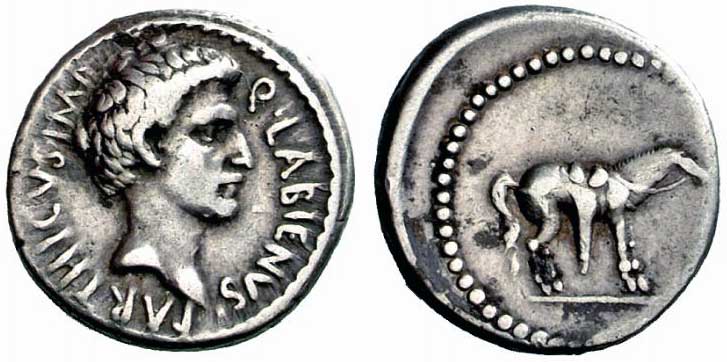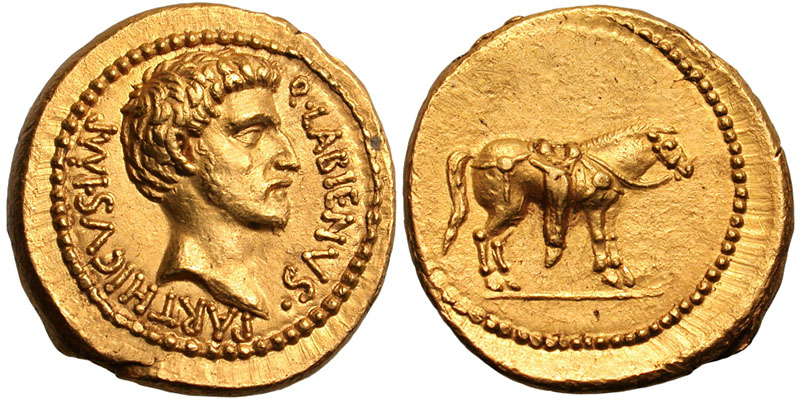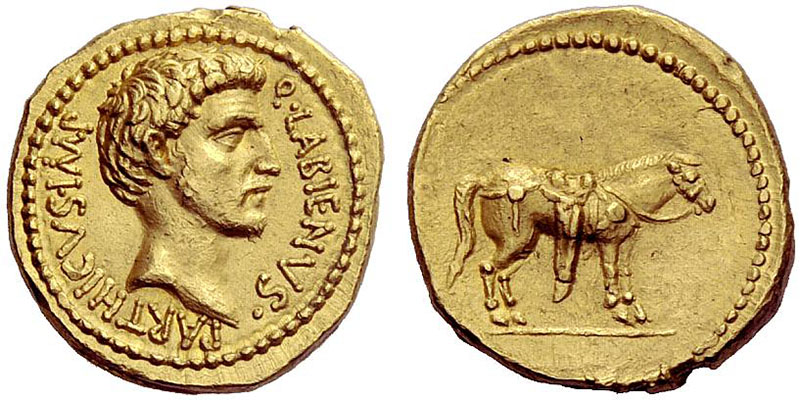 While allied with the Parthians, Labienus minted both silver and gold coins, but in only one type; they were probably used as a donative to Saxa's legions. Controversy exists on both the meaning of the obverse inscription and the riderless horse on the reverse. Was Labienus calling himself Imperator of the Parthians? Possibly the reverse design is an allusion to the missing, assassinated Julius Caesar, or maybe a tribute to the Parthian cavalry. Vagi [vol. I, p. 71] notes the engraving style of the aureus and denarius points to Antioch as the mint and late 40 B.C. as the date, and that some Antioch tetradrachms and bronzes can be ascribed to Labienus.