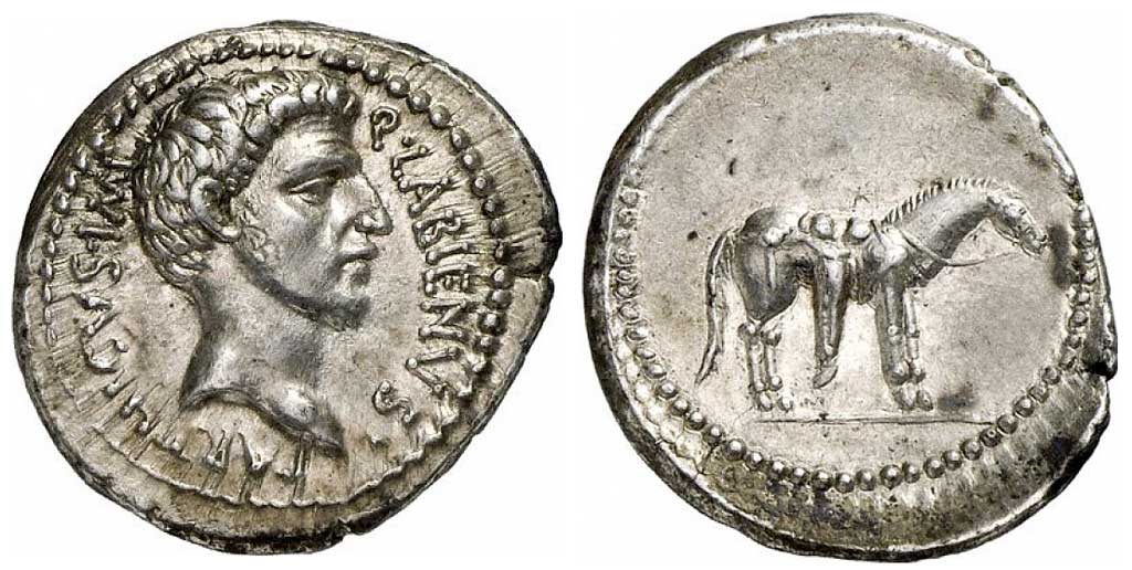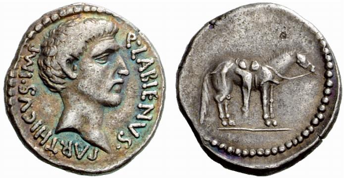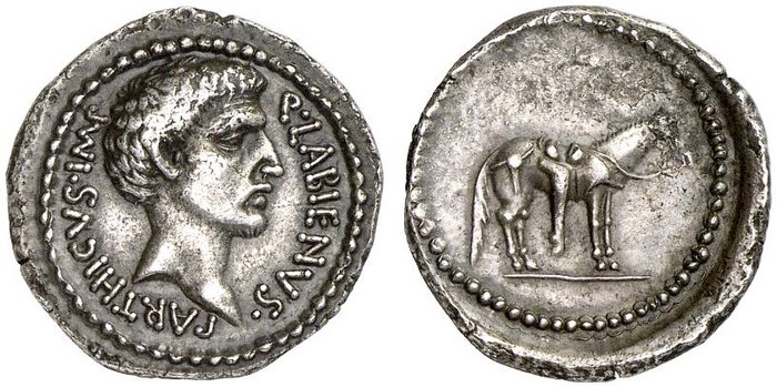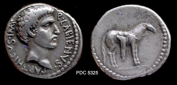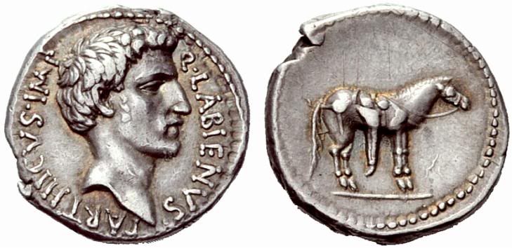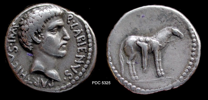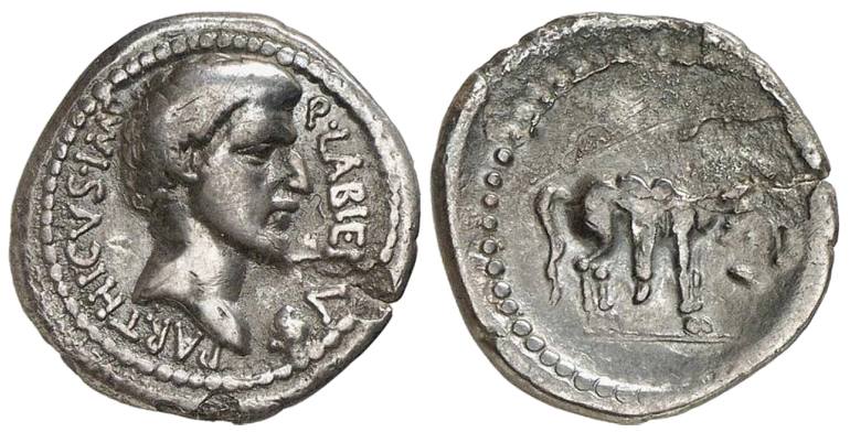 AR Denarius, 3.81 g (PDC 52663) Mint/ mint traveling with Labienus, undated (c. 40-39 B.C.) Obv/ as above Rev/ as above Note/ S21 Photo/ by Numismatica Ars Classica Additional images/ Cahn/Hess 1933 / Classical Numismatic Group - Numismatica Ars Classica 45 (2 Apr 2008), lot 51 (this coin); estimate 7000 CHF - CNG 40 (4 Dec 1996), James Fox collection, lot 1314 (this coin); estimate $10,000 - Monetarium (Swiss Credit), list 51 (1989), lot 136a (this coin) - Hersh, C. A. "The Coinage of Quintus Labienus Parthicus", SNR 59 (1980), p. 44, 3b and plate 4, A/3 (this coin) - Cahn/Hess (17 Jul 1933), E. J. Haeberlin Collection, lot 2900 (this coin) - Rollin et Feuardent (7 May 1888), De Quelen Collection, lot 505 (this coin) |