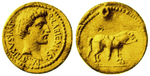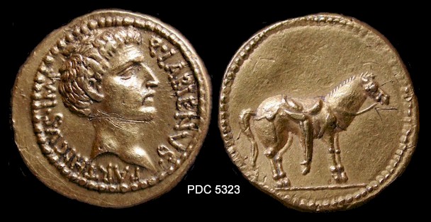 The coins of Labienus are rare; only five examples of the aureus are known; all are illustrated here. Images of the gold and silver coins on this page are serially numbered for identification in Notes. Click on coin images to enlarge: