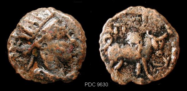 SeleuciaAE Dichalkous, 1.23g, 13mm, die axis = 1h Mint/ Seleucia, undated Obv/ bust of Tyche right Rev/ humped bull standing right; in front ΔΥ, above ΠΤ Prov/ collection Robert A. DeRose, Jr. Photo/ by Chris Hopkins - Sellwood 92.34 variant (dichalkous) |
