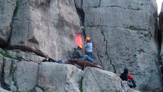 The preliminary survey of the Hung-e Azhdar, Hung-e Yaralivand and Hung-e Kamalvand rock reliefs revealed the presence of targets for photogrammetry on the rock surface of all the sculpted reliefs. These are rectangular targets made of paper that have been fixed to the rock surface by a strong glue. These operations do not pertain to the present project and the relevant targets have been previously fixed on the rock. The presence of these targets has been reported to local Authorities by the Iranian co-director before starting our operations. During the preliminary survey of the Hung-e Azhdar rock relief clear traces of rainwater erosion have been detected on the surface: these are originated particularly by a long crack on the upper part of the boulder, that works as a natural pipe for the water flowing from the top of the boulder when it rains.