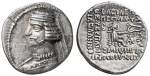 Mithradates III (57-54 B.C.) AR Tetradrachm (PDC 28098) Mint: Seleucia on the Tigris Obv: short-bearded bust left wearing diadem and hair covering ears; circular border of pellets Rev: king enthroned right holding bow, above which a flying Nike holds a wreath; no border; five-line Greek inscription = ΒΑΣΙΛΕΩΣ ΑΡΣΑΚΟΥ ΤΟΥΕΠΙΚΑΛΟΥΜΕΝΟΥ ΜΙΘΡΑΔΑΤΟΥ ΦΙΛΕΛΛΗΝΟΣ - Sellwood 41.1 [0 in db] |