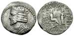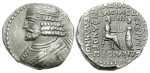 Vardanes I (A.D. 40-47) AR Tetradrachm 14.29g 12h (PDC 59874) Mint: Seleucia on the Tigris Dated 353 ΓΝΤ ΓΟΡΠΙΑΙΟΥ (42 AD) Obv: bust left with short pointed beard wearing diadem and spiral torque with no visible end; four waves in hair covering ear, hair above diadem as ringlets; wart visible on forehead; circular border of pellets Rev: male wearing diadem seated right on throne, extending right hand; to his right, Tyche stands left presenting palm branch in right hand, and holding cornucopia in left; above palm, Greek letters ΓΝΤ; in exergue, Greek letters ΓΟΡΠΙΑΙΟΥ; seven-line Greek inscription (L64i); no border = ΒΑΣΙΛΕΩΣ ΒΑΣΙΛΕΩΝ ΑΡΣΑΚΟΥ ΕΥΕΡΓΕΤΟΥ ΔΙΚΑΙΟΥ ΕΠΙΦΑΝΟΥΣ ΦΙΛΕΛΛΗΝΟΣ Provenance: ex Pars Coins Previous collection: Todd A. Ballen Photo by Classical Numismatic Group - Sellwood 64.9 [23 in db] - Triton XIII (5 Jan 2010), lot 724 (this coin) |