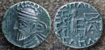 Vologases II (A.D. 77-80) AR Diobol (PDC 8029) Photo by permission Najaf Coins & Collectibles Inc. - Sellwood 1989.3 Num. Chron. 149, pl. 42, 3 (type 3) variant (legend) - Shore 392 |