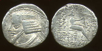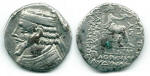 TetradrachmsAR Tetradrachm, 12.62g Mint/ Seleucia, August, 2 B.C. Obv/ bust left with pointed beard wearing diadem and beaded necklet with ornament, ear visible, hair above diadem as ringlets; no wart; circular border of dots Rev/ male wearing diadem seated right on throne, extending right hand; to his right, Tyche stands left presenting wreath in right hand, and holding cornucopia in left; above her arm, Greek letters ΙΤ, below arm Greek letter Π and pellet; in exergue, Greek letters ΓΟΡΠΙΑΙΟΥ; seven-line Greek inscription ΒΑΣΙΛΕΩΣ ΒΑΣΙΛΕΩΝ ΑΡΣΑΚΟΥ ΕΥΕΡΓΕΤΟΥ ΔΙΚΑΙΟΥ ΕΠΙΦΑΝΟΥΣ ΦΙΛΕΛΛΗΝΟΣ; no border Location/ Kunsthistorisches Museum, Vienna (Petrowicz plaster casts) Photo/ by Chris Hopkins - Sellwood 56.1 - Petrowicz p.100,2; pl.XV-1 (this coin) |