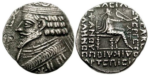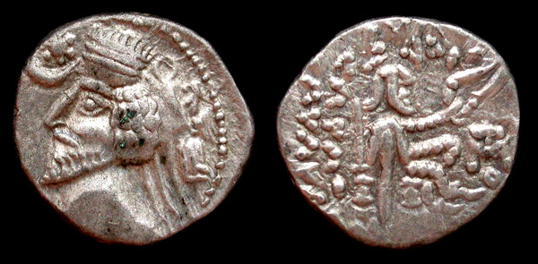 AR Drachm Mint/ Ecbatana, undated Additional images/[large obv & rev] Obv/ bust left with diagonal square-ended beard, wearing diadem and three-band spiral torque with no visible end; no wart; each side of head, Nike flying with diadem; circular border of dots Rev/ beardless archer wearing bashlyk and cloak seated right on throne, holding bow in right hand; below bow, monogram monogram 26; seven-line Greek inscription ΒΑΣΙΛΕΩΣ ΒΑΣΙΛΕΩΝ ΑΡΣΑΚΟΥ ΕΥΕΡΓΕΤΟΥ ΔΙΚΑΙΟΥ ΕΠΙΦΑΝΟΥΣ ΦΙΛΕΛΛΗΝΟΣ; no border Location/ Smithsonian Institution, no. 1979.1216.0119 Photo/ by permission Smithsonian Institution, National Numismatic Collection - Sellwood 57.13 |
