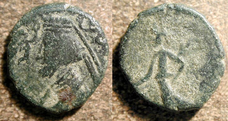 AE Chalkous, 1.76g, 14mm Mint/ Ecbatana, undated Obv/ bust left with diagonal square-ended beard, wearing diadem and three-band spiral torque with no visible end; no wart; each side of head, Nike flying with diadem; circular border of dots Rev/ three-quarter length figure of Tyche standing left at altar holding palm; no inscription; no border Location/ Bibliothèque nationale de France, no. JdM 551 Photo/ by Chris Hopkins - Sellwood 57.16 |