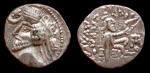 AR Tetradrachm Mint/ Seleucia, March, A.D. 1 Obv/ bust left with pointed beard wearing diadem and three-band spiral torque with no visible end; ear visible, hair above diadem as ringlets; wart visible on forehead; in front, Nike flying right with diadem; circular inscription ΒΑΣΙΛΕΩΣ ΒΑΣΙΛΕΩΝ; on diadem pendant, Greek letters ΒΙΤ; circular border of dots Rev/ bust of Musa right wearing tiara, diadem and beaded necklet with ornament; on diadem pendant, Greek letters ΞΑΝ; in front, Nike flying left with diadem; two-line Greek inscription ΘΕΑΣ ΟΥΡΑΝΙΑΣ ΜΟΥΣΗΣ ΒΑΣΙΛ[ΙΣΣΕΣ] Photo/ by permission Najaf Coins & Collectibles Inc. - Sellwood 58.1 |