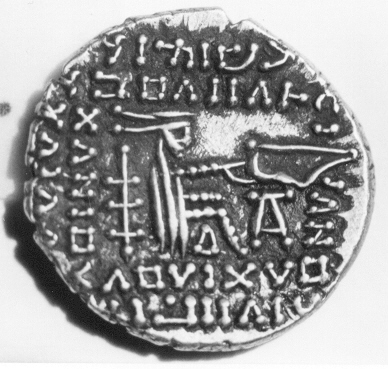 AR Tetradrachm Mint/ Seleucia, November, A.D. 152 Obv/ cuirassed bust of king left, long tapered beard, wearing tiara. Β behind head Rev/ king enthroned left, receiving diadem from Tyche. Greek inscription ΒΑΣΙΛΕΩΣ ΒΑΣΙΛΕΩΝ / ΑΡΣΑΚΟΥ ΟΛΑΓΑΣΟΥ / ΔΙΚΑΙΟΣ / ΕΠΙΦΑΝΟΥ ΦΙΛΕΛΛΗΝΟΣ. Between the heads of Tyche and the king is the Greek numeral ΔΞΥ, year 464 of the Seleucid era (A.D. 152). Inner line of inscription at the bottom is ΑΠΕΛΛΙΟΥ, or November Photo/ by permission Doug Smith's Ancient Greek & Roman Coins - Sellwood 84.13 - Mitchiner ACW 684 similar |