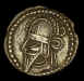 AR Drachm, 3.55 g Mint/ Ecbatana, undated Obv/ bust left with long, pointed beard extending beyond beaded border; wearing tiara with ear flaps, pellets on stalks round crest and a line of pellets on stalks on side; lines coming out of crest and diadem with loop at the top and two ends. Monogram Shore 85 behind head (abbreviated king's name in Aramaic) Rev/ archer seated right on throne holding bow, below bow monogram. Blundered Greek legend with top line in Aramaic Photo/ by permission Dr. Busso Peus Auktion 363, Lot 5199 - Sellwood 88.18 - Shore 456 |